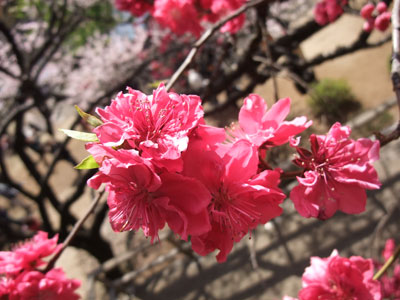 コレは桜?と思わせて実は桃、ハナモモといって一本の木が赤と白のツートンという源平モモだそうで、