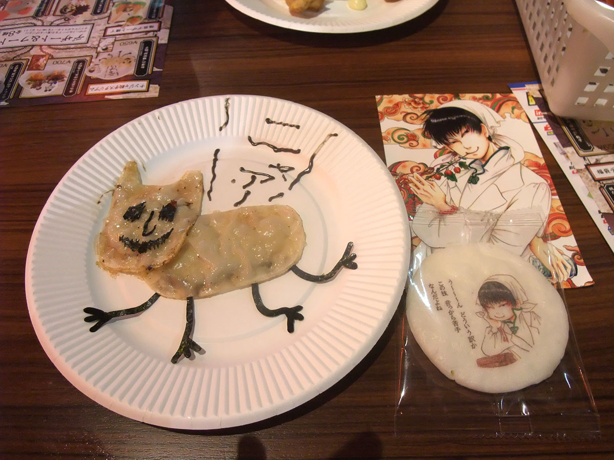 鬼灯の冷徹と弱ペダメニューを楽しみに行ったのですが、結局鬼灯メニューチョイスばっかになってました。いや鬼灯の方がポストカードがアニマル系が多くて可愛かったから(腐萌え無いと途端にアニマルかちっさいもんに走る私)。友人の頼んだ餃子の完成度がやばかったです。チラシ写真よりイイ出来ってどーゆー事。
