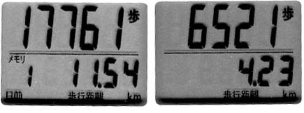 ので以前何故か買ってしまった万歩計を付けていってみました。下が結果、向かって左がスパコミ、右が今日、今日は駅周辺にお買物に出かけています。