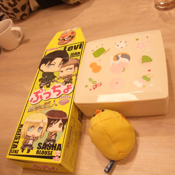 年若い友人がゲームで取ってくれた進撃ぷッちょ&にゃん子先生お重。